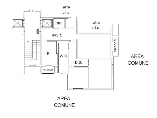 L'appartamento è composto da ingresso, soggiorno, cucina, disimpegno, una camera da letto, bagno, ripostiglio, balcone e veranda, per una superficie totale di 89 mq.