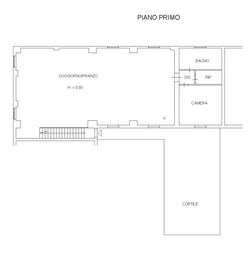 L'immobile, con accesso da scala interna dal piano terra, è composto al piano primo da ampio soggiorno con cucina, disimpegno, una camera da letto, ripostiglio e bagno, per una superficie di 209 mq.
