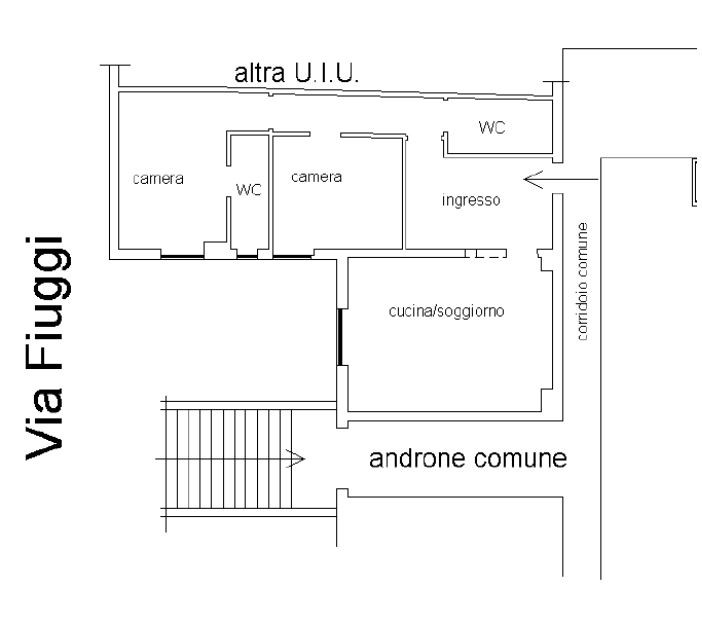 L'appartamento, da ristrutturare, è composto da ingresso, soggiorno con angolo cottura, disimpegno, due camere da letto e doppi servizi, per una superficie totale di 75,40 mq.