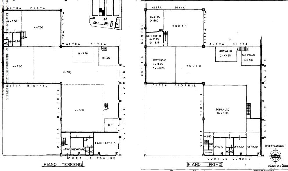 Presente inoltre corpo su due livelli, composto da ripostigli, uffici e servizi, rispettivamente al piano terra di 103 mq. e al piano primo di 103 mq.