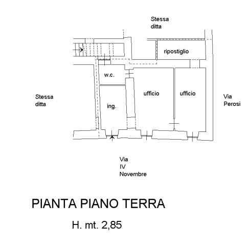 L'immobile, internamente ristrutturato, è composto da tre locali studio, disimpegno, un locale ripostiglio, bagno e un ripostiglio sottoscala, per una superficie totale di 68 mq.