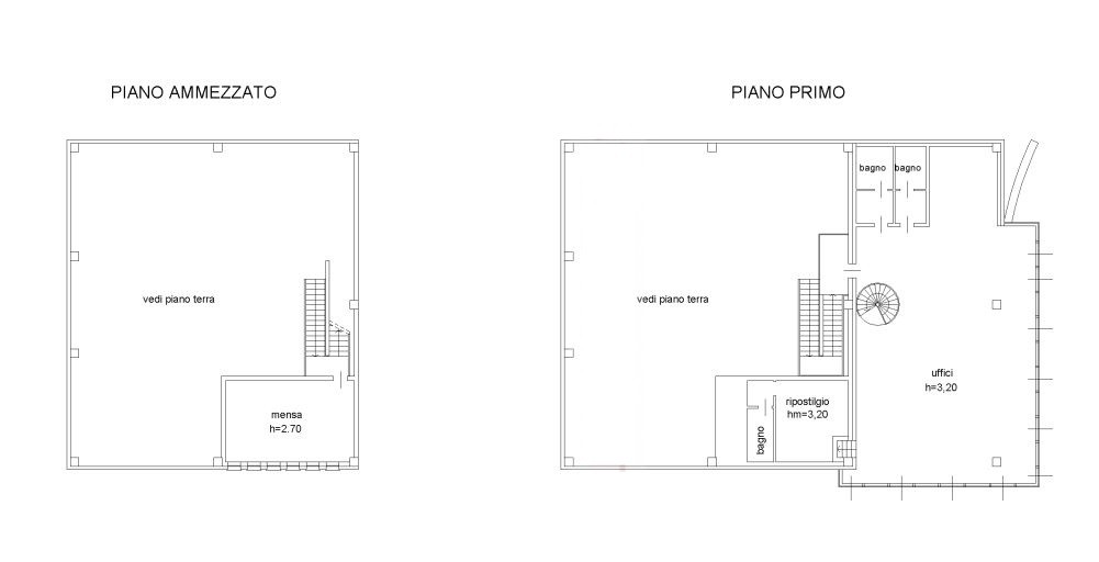 Al piano ammezzato presente locale mensa oggi utilizzato come deposito, per una superficie di 35 mq.