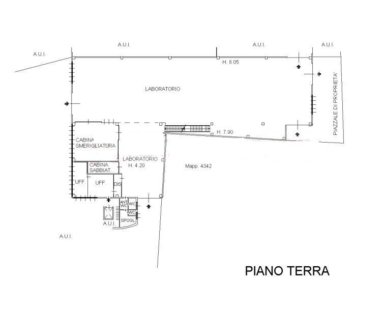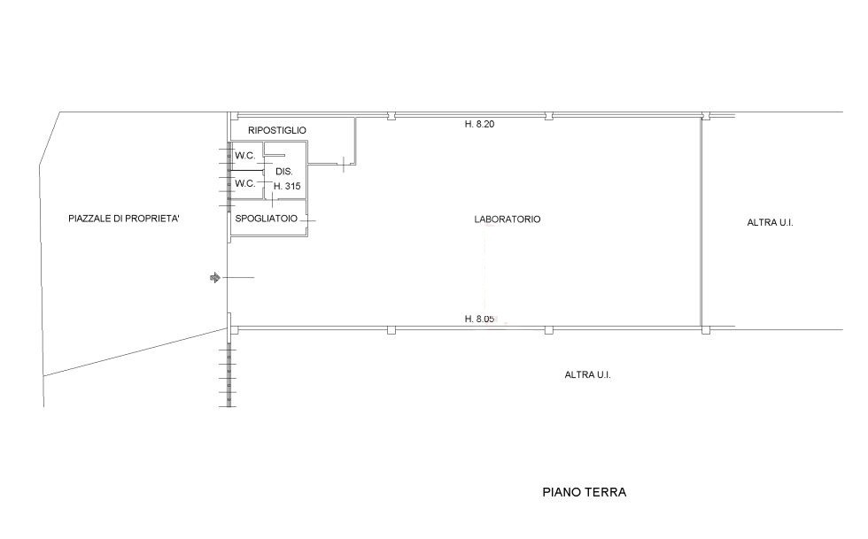 Corpo A: Ampio laboratorio al piano terra, composto da deposito, spogliatoi e doppi servizi , per una superficie di 395 mq. Oltre a cortile esclusivo di 170 mq.,